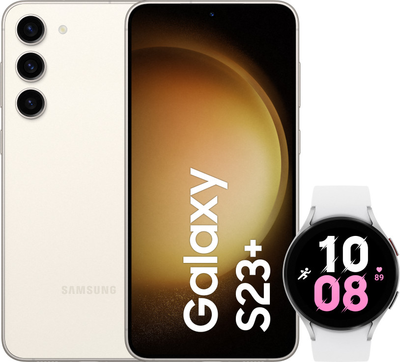 Met de Galaxy Watch5 Zilver 44mm om je pols ben je altijd op de hoogte van je meldingen en oproepen, terwijl je geniet van de nieuwe Samsung Galaxy S23 Plus 256GB Crème 5G. Deze smartwatch maakt het ook mogelijk om contactloos te betalen en biedt een uitgebreid inzicht in je gezondheid dankzij verschillende ingebouwde sensoren. De S23 Plus is een krachtige smartphone met een groot 6,6 inch scherm, perfect om comfortabel naar je favoriete films en series te kijken in full hd. Dankzij de krachtige Snapdragon-processor is dit toestel in staat om de zwaarste taken en 3D-games moeiteloos aan te kunnen. De Galaxy S23 Plus is uitgerust met 3 camera's aan de achterkant, waarmee je haarscherpe foto's en verbluffende 8K-video's kunt maken. Met het ruime 256 GB opslaggeheugen kun je al je foto's, apps en andere bestanden gemakkelijk opslaan. Mocht je meer ruimte nodig hebben, dan is er ook een 512 GB model beschikbaar. En maak je geen zorgen over de batterijduur, want de 4.700 mAh batterij gaat bij gemiddeld gebruik ongeveer een hele dag mee. Met deze combinatie van de Samsung Galaxy S23 Plus en de Galaxy Watch5 Zilver 44mm ben je klaar om moeiteloos verbonden te blijven en te genieten van al het moois dat de technologie te bieden heeft.