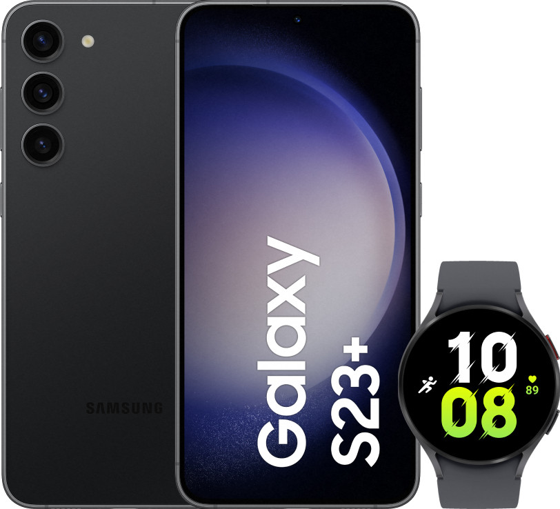 Met de Samsung Galaxy S23 Plus 256GB Zwart 5G en de bijbehorende Galaxy Watch5 Zwart 44mm ben je helemaal klaar voor de toekomst. Met deze combinatie heb je niet alleen een krachtige smartphone, maar ook een slim horloge dat je een nieuwe dimensie geeft in het dagelijks leven. De Galaxy Watch5 Zwart 44mm houdt je altijd op de hoogte van belangrijke meldingen en oproepen, zodat je nooit meer iets belangrijks mist. Bovendien kun je met deze smartwatch contactloos betalen, waardoor je altijd snel en gemakkelijk kunt afrekenen. Maar dat is nog niet alles! De Galaxy Watch5 Zwart 44mm is ook uitgerust met verschillende sensoren die je gezondheid in de gaten houden. Zo krijg je een beter inzicht in je activiteiten, hartslag en slaappatroon. Hierdoor kun je jouw gezondheid beter monitoren en eventuele verbeteringen aanbrengen. En dan hebben we het nog niet eens gehad over de Samsung Galaxy S23 Plus 256GB Zwart 5G. Deze smartphone heeft een groot 6,6 inch scherm, waardoor je optimaal kunt genieten van je favoriete films en series in full hd-kwaliteit. De krachtige Snapdragon processor zorgt ervoor dat je moeiteloos multitaskt en de zwaarste taken en 3D-games aankan. Met de 3 camera's aan de achterkant van de Galaxy S23 Plus maak je haarscherpe foto's en 8K video's, zodat je al je mooie momenten voor altijd kunt vastleggen. En dankzij het ruime.