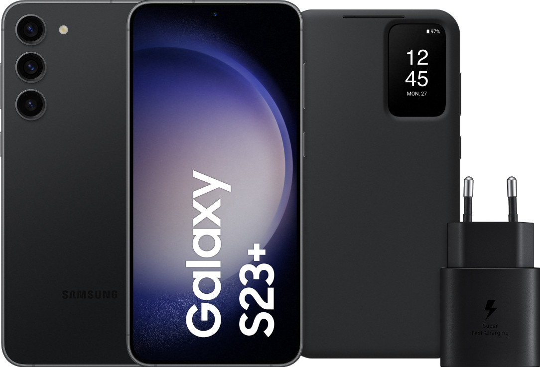 Dit accessoirepakket is de perfecte aanvulling op je Samsung Galaxy S23 Plus 512GB Zwart 5G. Samsung levert geen oplader mee, maar met deze bundel ontvang je een snellader van 25 watt, waarmee je jouw telefoon in slechts een uur volledig kunt opladen. De Clear View book case biedt optimale bescherming voor je nieuwe S23 Plus, terwijl je ook nog eens snel je meldingen en oproepen kunt bekijken. De S23 Plus is een krachtige smartphone met een indrukwekkend 6,6 inch scherm, waarop je comfortabel kunt genieten van je favoriete films en series in full hd. Dankzij de krachtige Snapdragon processor is dit toestel in staat om zelfs de meest veeleisende taken en 3D-games moeiteloos aan te kunnen. Aan de achterkant van de Galaxy S23 Plus bevinden zich maar liefst 3 camera's, waarmee je haarscherpe foto's en adembenemende 8K-video's kunt maken. Met een opslagcapaciteit van maar liefst 512 GB heb je meer dan genoeg ruimte om al je foto's, apps en opgeslagen films en series op te slaan. De krachtige 4.700 mAh batterij zorgt ervoor dat je bij gemiddeld gebruik de hele dag door kunt gaan, zonder je zorgen te hoeven maken over een lege batterij. Met dit accessoirepakket ben je vanaf dag één voorzien van de juiste accessoires om optimaal te kunnen genieten van je Samsung Galaxy S23 Plus 512GB Zwart 5G.