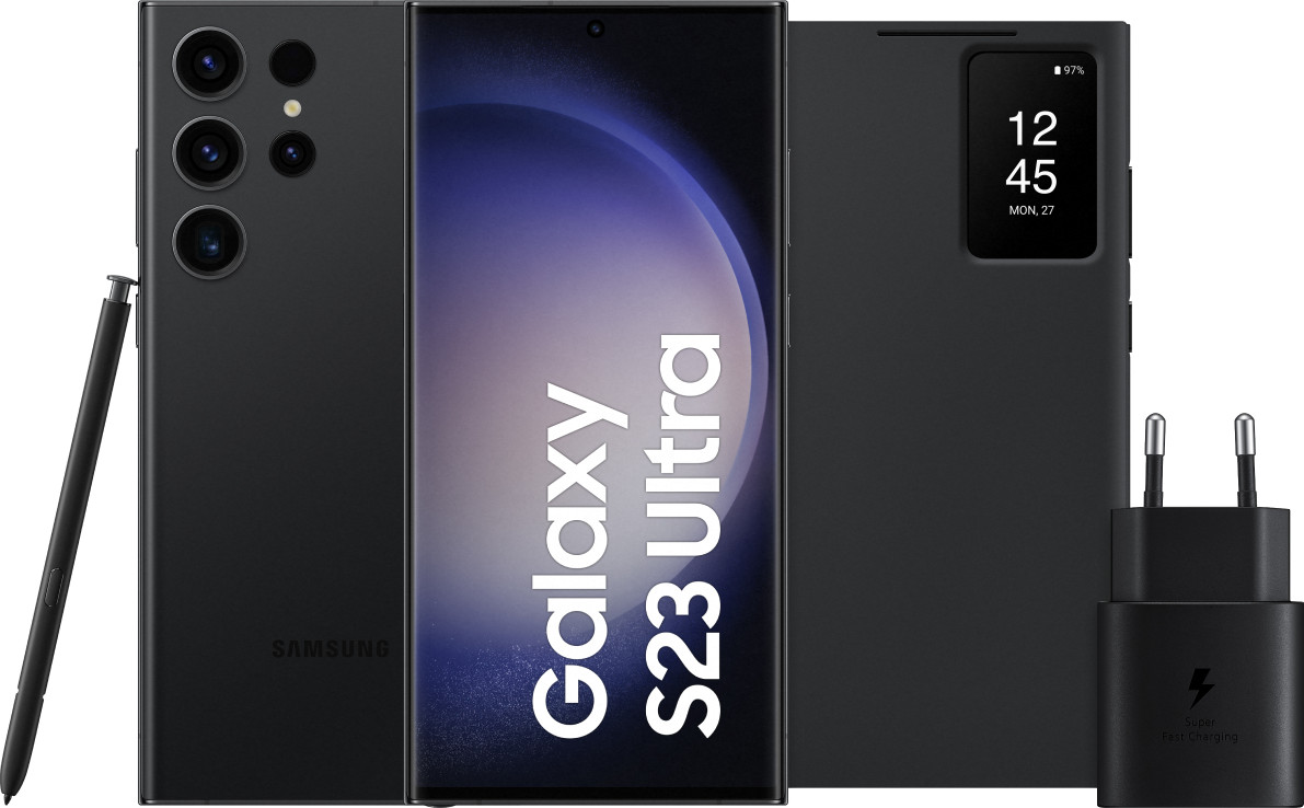 Met het accessoirepakket voor de Samsung Galaxy S23 Ultra 1TB Zwart 5G heb je meteen de juiste accessoires bij de hand. Samsung levert geen oplader mee, maar in deze bundel zit een snellader van 25 watt waarmee je je toestel in ongeveer een uur volledig kunt opladen. Met de handige Clear View book case bescherm je jouw nieuwe S23 Ultra tegen schade en kun je snel je meldingen en oproepen bekijken. Deze smartphone is uitgerust met fantastische camera's. Met de 4 camera's aan de achterkant maak je kristalheldere foto's en opnames in 8K-resolutie. De telelens biedt tot 10x zoom zonder dat je foto's aan kwaliteit verliezen. Met het royale 1TB opslaggeheugen hoef je je geen zorgen te maken dat je snel ruimte tekort komt. Er is genoeg ruimte voor al je foto's, video's, apps en opgeslagen series en films. Het grote 6,8 inch quad hd-scherm zorgt voor comfortabel kijkplezier bij het bekijken van films en series. Dankzij de krachtige Snapdragon-processor voer je moeiteloos de zwaarste taken uit. Daarnaast kun je nauwkeurige aantekeningen maken met de meegeleverde S Pen-stylus. De grote 5.000 mAh batterij gaat bij gemiddeld gebruik de hele dag mee.